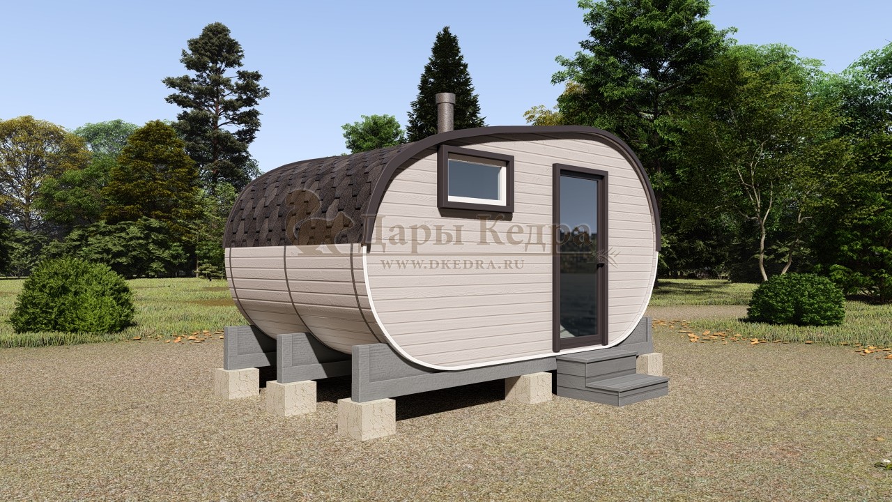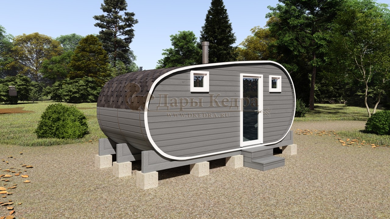 Баня-бочка буханка из кедра 4 метра Это более просторная модель за счет увеличенной высоты потолков и ровного пола. В такой модели раздевалка совмещена с моечной. Тут установлен душевой поддон, вешалка, полочка и лавочка из кедра. В парильном отделении по обе стороны расположены двухуровневые открытые полки, печь находится между ними у дальней стены. Время растопки такой бани не превышает 30 минут. По вашему желанию баню-бочку можно укомплектовать козырьком, верандой и печью с внешней загрузкой, благодаря которой весь мусор во время топки остается на улице. Баня-бочка буханка не требует полноценный фундамент, поэтому при необходимости ее можно перенести в другое место. Обращаем Ваше внимание, что в стандартную комплектацию бани входят полки открытого типа в парной с обеих сторон. Дополнительно можно заказать полок закрытого типа или лавку! Кедр обладает ароматическими свойствами. Он не деформируется и влагоустойчив, при правильном уходе за деревом на нем не развиваются грибки и плесень.