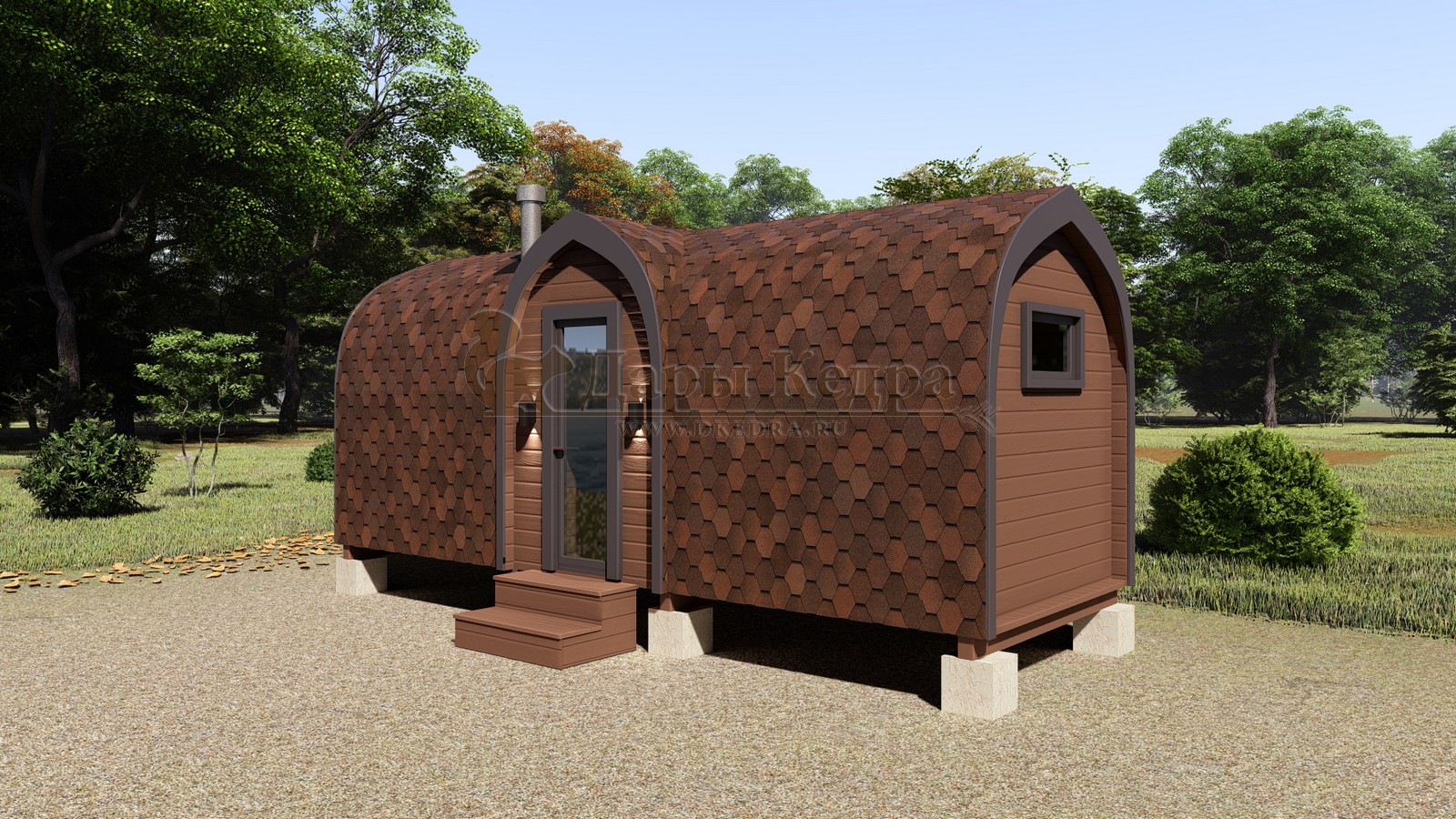 Баня-бочка «Пентагон» с панорамным окном Стильная и современная баня-бочка может быть выполнена длиною от 4 метров, с двумя отделениями (парилка и комната отдыха). Полок может быть, как с двух сторон, так и угловой, в стандарте двухуровневый. Печь в данной модели расположена сбоку с топкой внутрь парилки, либо наружу или в соседнее помещение. Печь можно укомплектовать баком для воды, а саму баню сделать длиною до 6 метров, комфортно разместив в ней дополнительно помывочную. Панорамное окно на входе добавит света и уюта в раздевалке. Установив баню в живописном месте, во время процедур можно наслаждаться видами из окна. В эту модель включено одно закаленное квадратное стекло в комнате отдыха. Обращаем Ваше внимание, по умолчанию в данной модели отсутствует бак для воды, вместо него идёт утеплённая термо-труба, которую можно заменить на бак по желанию.