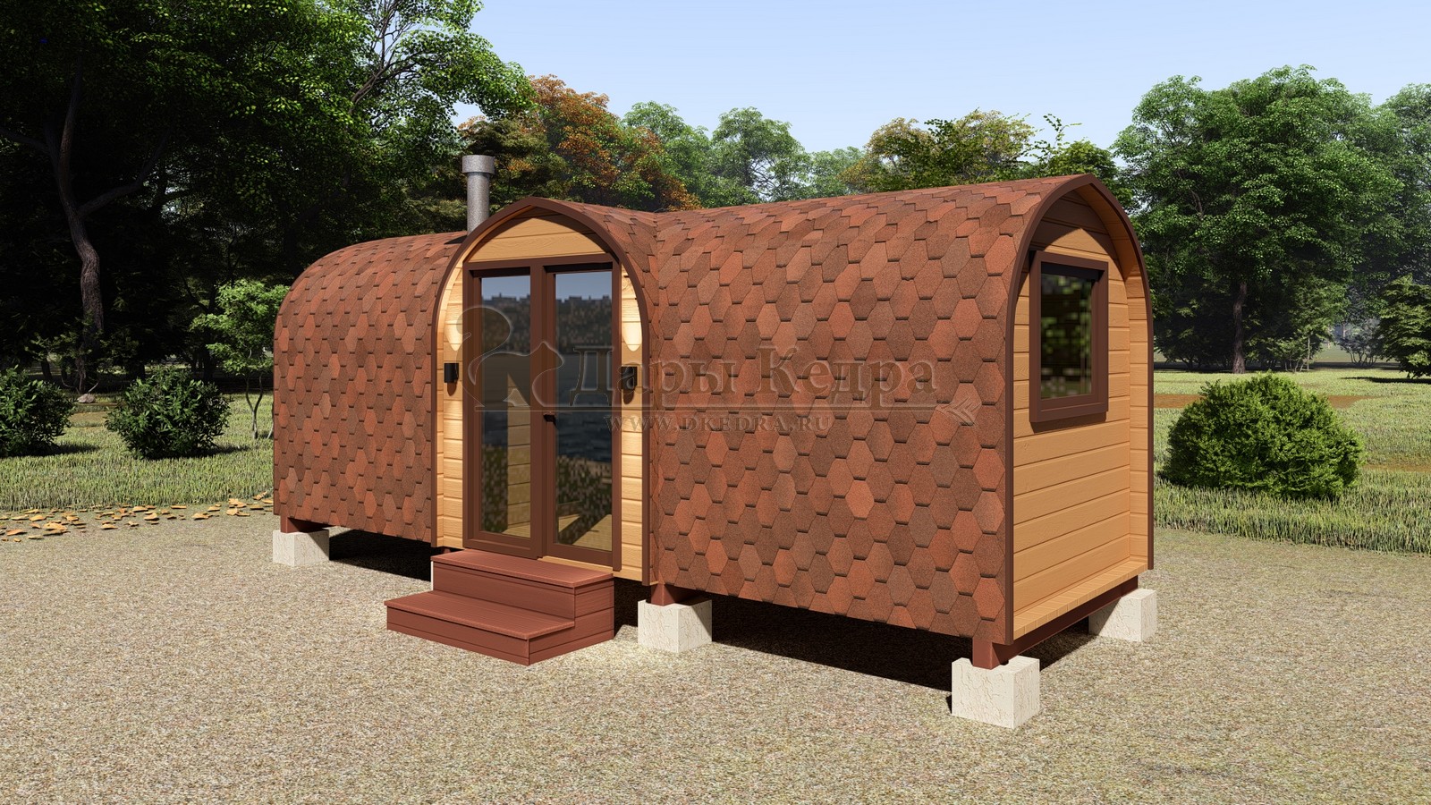Баня-бочка буханка из кедра 6 метров с верандой Главной отличительной особенностью данной бани «Буханка» является полная обшивка гибкой черепицей всей внешней части бани, а так же наличие крытой входной группы. Включает в себя небольшую веранду, раздевалку, которая служит комнатой отдыха, моечную и парильное отделение. Для удобства пользования в раздевалке находятся лавочки и вешалка из кедра. Моечная оборудована душевым поддоном, полочкой и лавочкой. В парильном отделении по обе стороны расположены двухуровневые открытые полки, печь установлена между ними у дальней стены. Время растопки такой бани не превышает 30 минут. По вашему желанию баню-бочку можно укомплектовать козырьком, верандой и печью с внешней загрузкой, благодаря которой весь мусор после топки остается на улице. Баня-бочка буханка не требует полноценный фундамент, поэтому при необходимости ее можно перенести в другое место. Обращаем Ваше внимание, что в стандартную комплектацию бани входят полки открытого типа в парной с обеих сторон. Дополнительно можно заказать полок закрытого типа или лавку! Кедр обладает ароматическими свойствами. Он не деформируется и влагоустойчив, при правильном уходе за деревом на нем не развиваются грибки и плесень.