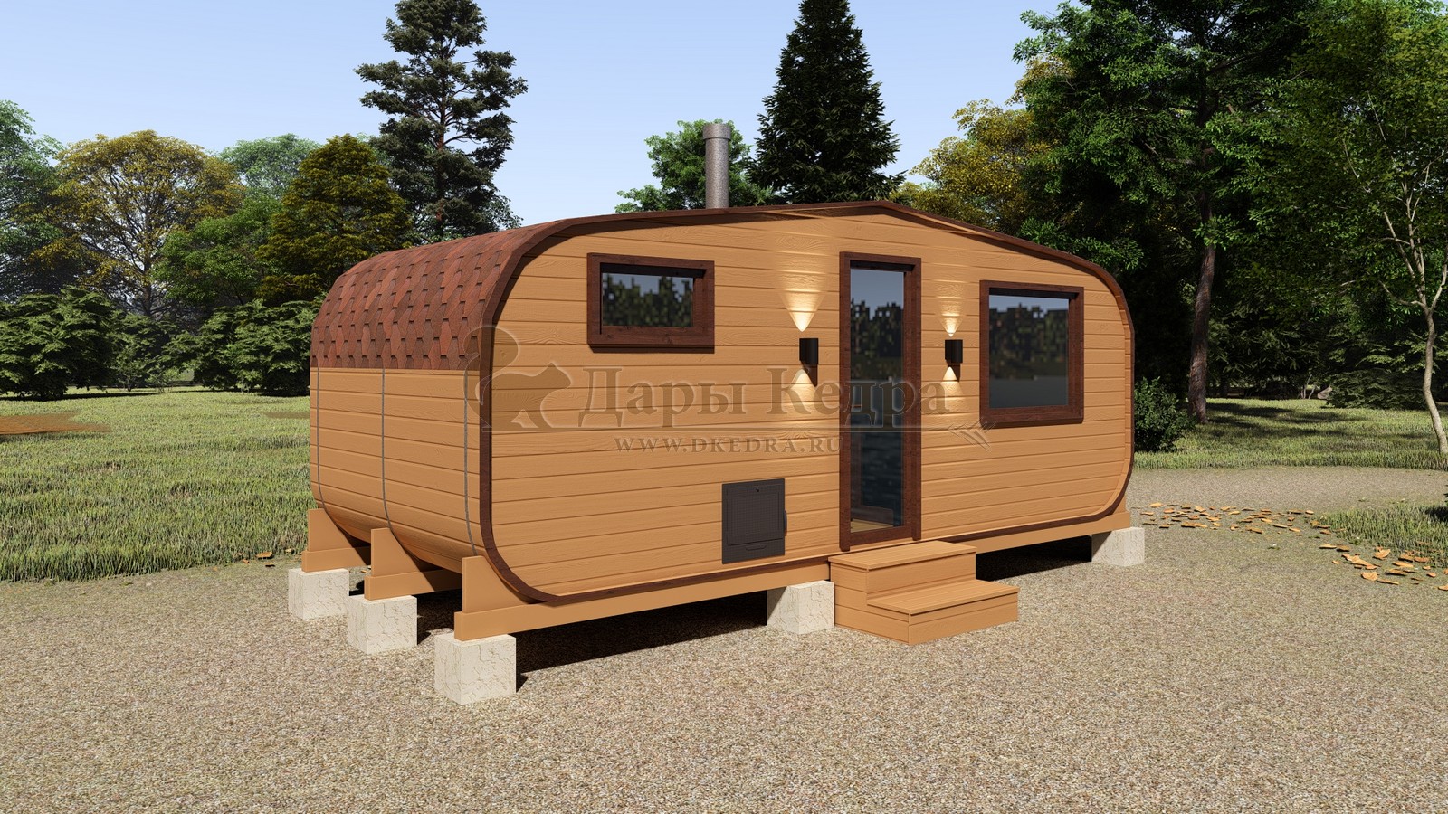 Баня-бочка буханка из кедра с боковым входом (все размеры) Это самая просторная модель бани. Благодаря этому ее можно использовать не только по назначению, но и в качестве летнего домика. Боковой вход у такой модели находится в начале или в середине конструкции. Моечная оснащена душевым поддоном. Двухуровневый открытый полок и лавочка в парилке сделает принятие процедур более комфортным. По вашему желанию баню-бочку можно дополнить печью с внешней загрузкой, благодаря которой весь мусор после топки останется на улице. Баня-бочка буханка из кедра с боковым входом не требует полноценный фундамент, поэтому при необходимости ее можно перенести в другое место. Обращаем Ваше внимание, что в стандартную комплектацию бани входят полки открытого типа в парной с обеих сторон. Дополнительно можно заказать полок закрытого типа или лавку! Кедр обладает ароматическими свойствами. Он не деформируется и влагоустойчив, при правильном уходе за деревом на нем не развиваются грибки и плесень.