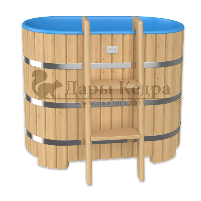 Особенность этой модели заключается в сборке купели по технологии лунный-паз. Паз (углубление) одной доски прочно соединяется с выемкой следующей. Такая сборка осуществляется без клея и гвоздей. Готовая конструкция прочно фиксируется нержавеющими обручами. Пластиковая вставка придает изделию красивый внешний вид, увеличивает срок службы и облегчает уход за купелью. Для удобства пользования купель оснащена лавочками, приставной и внутренней лестницей из кедра. Подходит для комнатного и уличного использования.