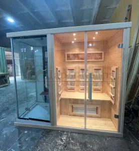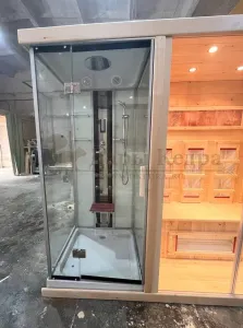 Сауна из кедра с душевой кабиной - это рациональное решение для вашего дома или спа-салона. Деревянный фасад со стеклом преобразит интерьер помещения. Благодаря встроенной душевой кабине можно комфортно завершить процедуру парения.