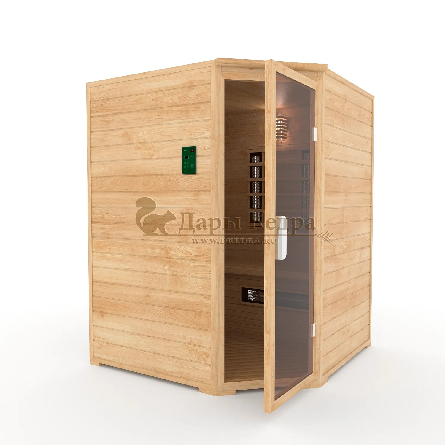 Это специально оборудованная кедровая кабина для прогрева тела человека сухим теплом. Воздух в таких парных не нагревается. Инфракрасные лучи воздействуют на тело, равномерно прогревая мышцы, суставы и органы. Керамические излучатели похожи на лампы, имеют высокую температуру нагрева, поэтому защищены противоожоговыми решетками. Тело человека в таких саунах нагревается интенсивнее. Работает кабина за счет электричества. Установка сауны в угол, позволяет рационально использовать пространство помещения. Подходит как для домашнего использования, так и для коммерции.